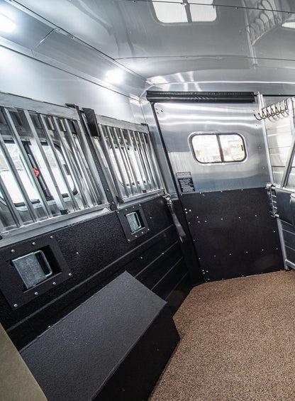 This latch is installed in the stall area of the trailer. The dividers slam into it to latch in, lift the paddle latch to release.